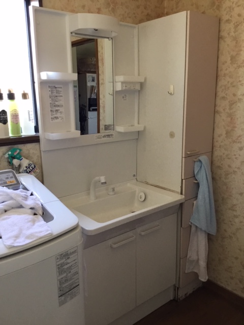 | 解決方法 | 20年程お使いになられていましたので、洗面台の交換をご提案させていただき、ノーリツ洗面化粧台シャンピーヌ(3面鏡)に交換させていただきました。 |